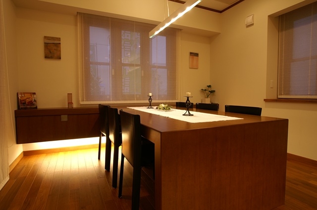 ダイニングテーブルの真上に低めの灯りをもってくることにより、見た目の演出、特別感がでます。